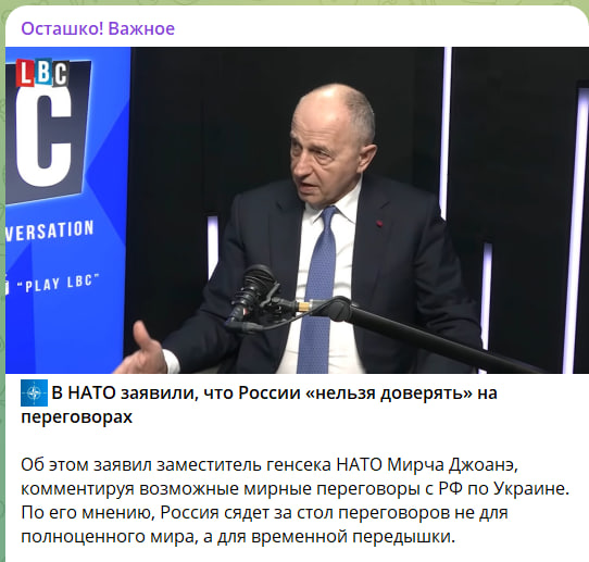 Заместитель генерального секретаря НАТО Мирча Джоанэ в интервью LBC заявил, что Запад отказывается от мирных переговоров по Украине из-за острого недоверия к России.