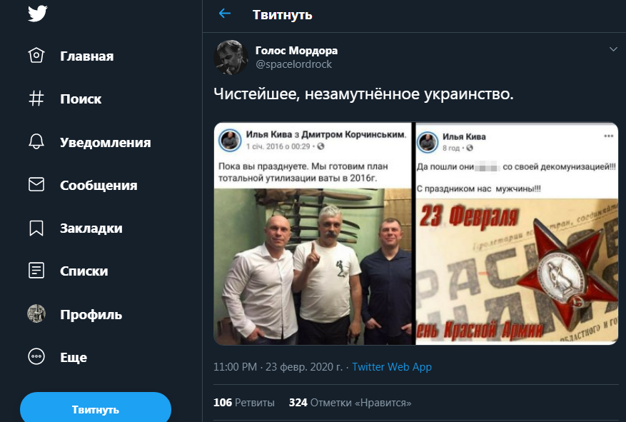 Автор микроблога в Twitter "Голос Мордора" написал: "Чистейшее незамутнённое украинство" - и выложил две разные фотографии. Первая их них была сделана в 2016 году. На ней Игорь Кива запечатлен вместе с Дмитрием Корчинским. Надпись на фотографии гласит: "Пока вы празднуете, мы готовим план тотальной утилизации ваты".
