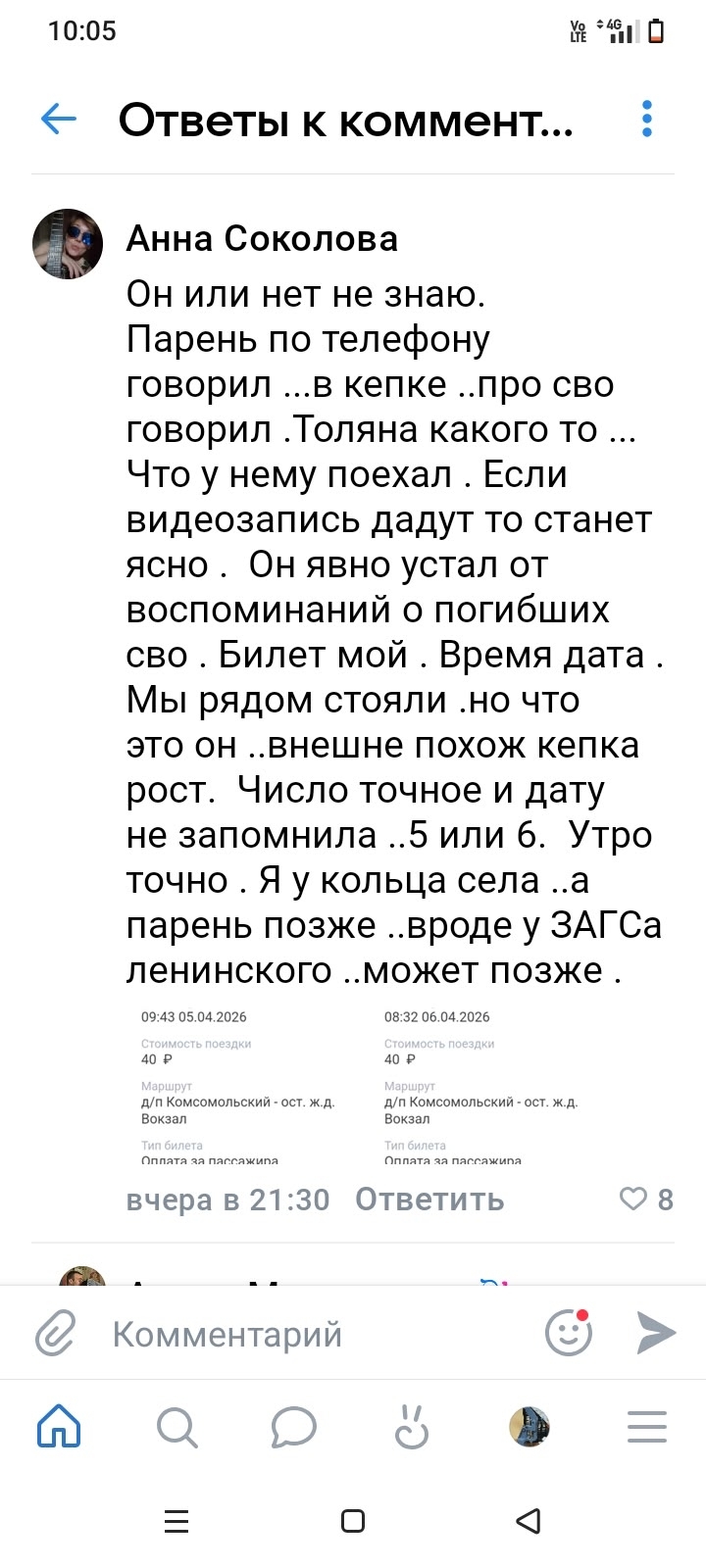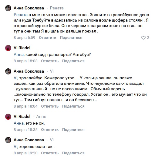 Соколова посоветовала обратиться в троллейбусное депо и запросить видеозапись из салона. Женщина отметила, что стояла возле шофера, а похожий на Алексея мужчина стоял рядом.