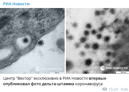 "РИА Новости" со ссылкой на центр "Вектор" впервые показало, как выглядит "дельта"-штамм коронавируса.