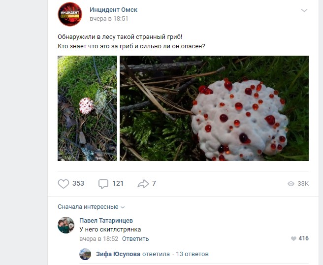 В лесу под Омском был замечен не типичный для сибирских лесов гриб — Кровоточащий Зуб. Отмечается, что он распространен в Северной Америке. Есть упоминания, что подобные грибы видели в Шотландии. Примечательно, что сам гриб, несмотря на свой устрашающий вид, издает вкусный запах сливы.