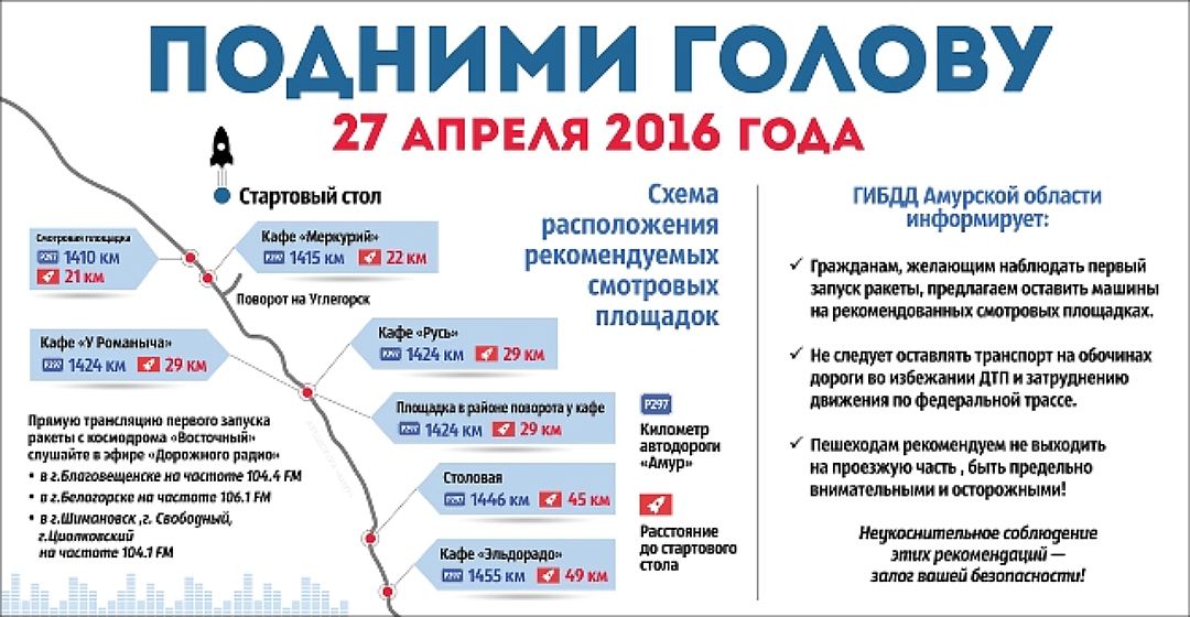 Вдоль федеральной трассы "Амур" установлены смотровые площадки, где смогут разместиться все желающие вживую посмотреть на первый запуск с русского космодрома Восточный. Как отмечают власти Приамурья, площадки позволят наблюдать за действом с максимальным комфортом.