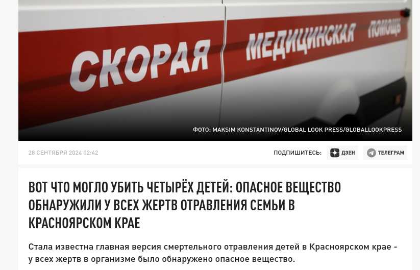 Напомним, что 21 сентября члены многодетной семьи из посёлка Красная Сопка почувствовали себя плохо и обратились к медикам. Однако врачам не удалось спасти четверых детей - они умерли один за другим. Сообщалось, что не меньше месяца потребуется специалистам, чтобы установить причину смерти четырёх детей в посёлке Красная Сопка.