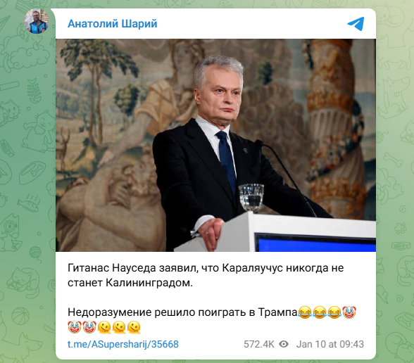 Поводом к этому оказалось переименование Мемориального музея Кристионаса Донелайтиса в посёлке Чистые Пруды. Науседа начал сетовать, что Калининградская область некогда была "частью Малой Литвы" и "последние следы литовской культуры там необходимо сохранить". Разумеется, при этом политик совершенно не вспоминает, что в его стране развёрнута яростная война с культурой русской и много лет насаждается русофобия… Классика: вы не понимаете, это другое.