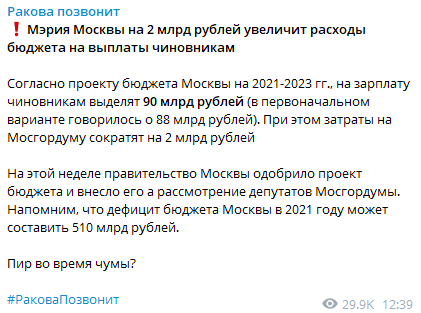 С чем связана необходимость увеличения и без того больших затрат на содержание московских чиновников, не уточняется. Telegram-канал "Ракова позвонит" в шутку назвал такое "затягивание поясов" "пиром во время чумы".