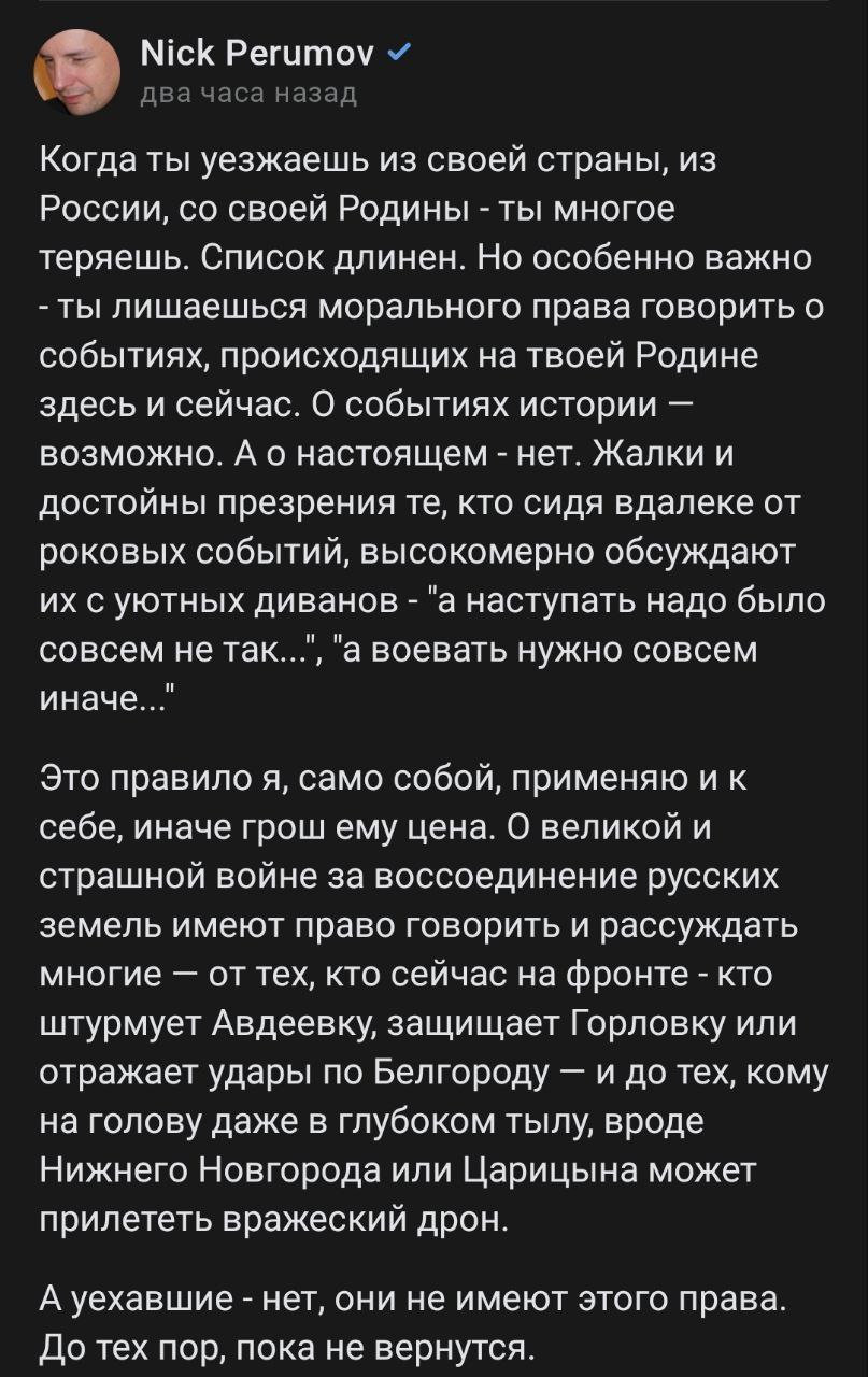 Перумов подчеркнул, что об СВО сейчас могут говорить только те, кто "штурмует Авдеевку, защищает Горловку или отражает удары по Белгороду". Также моральное право высказаться есть у тех, "кому на голову, даже в глубоком тылу, вроде Нижнего Новгорода или Царицына, может прилететь вражеский дрон".