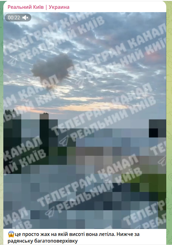 Это просто ужас, на какой высоте она летела. Ниже советской многоэтажки. На земле видны задымления, но не пожар. Вероятно, остатки сбитой ракеты,
