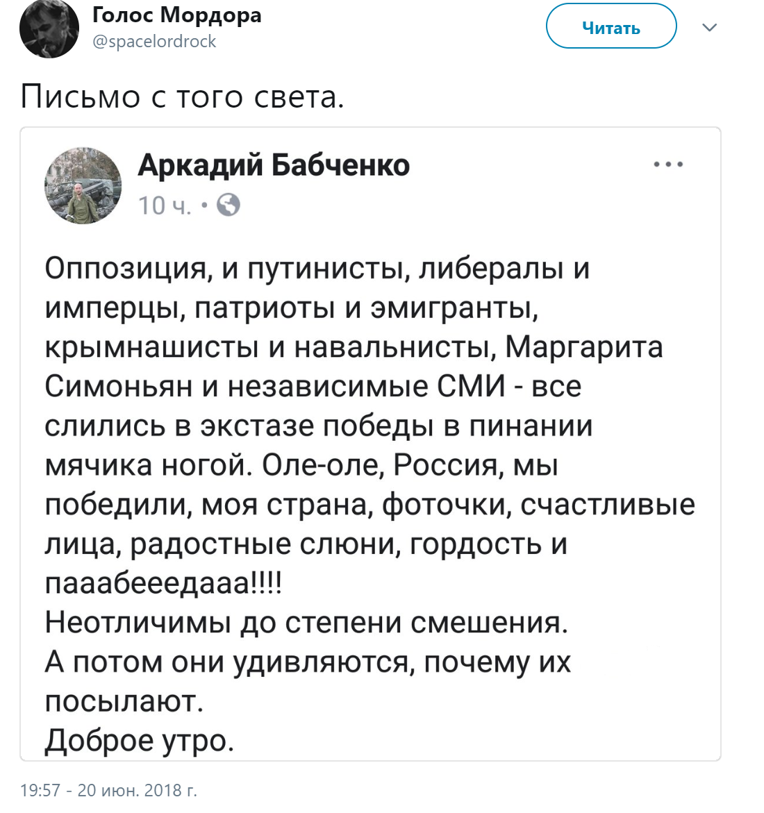 К числу русофобски настроенных болельщиков присоединился и Аркадий Бабченко, инсценировавший на Украине свою смерть. Он разразился гневным постом, возмущаясь тем, что в РФ радуются успехам футболистов.