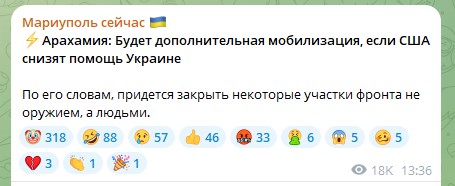 Судя по реакции подписчиков проукраинского канала, слова Арахамии мало кого вдохновили среди "потриотив" Фото: Скриншот Telegram/Мариуполь сейчас