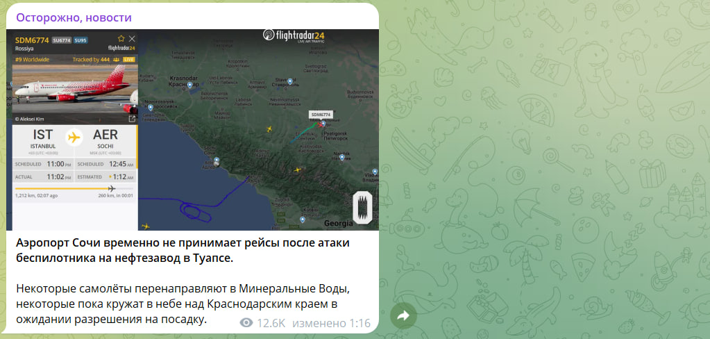 В сочинском аэропорту, по сообщению телеграм-канала SHOT, введён план "Ковёр". Это связано с возможной угрозой атаки БПЛА со стороны Украины. Часть рейсов уже перенаправили в Минеральные Воды. Другие самолёты кружат в небе в ожидании посадки.