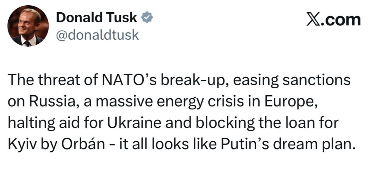 Угроза распада НАТО, ослабление санкций в отношении России, масштабный энергетический кризис в Европе, прекращение помощи Украине и блокирование кредита для Киева Орбаном - все это выглядит как план мечты Путина,