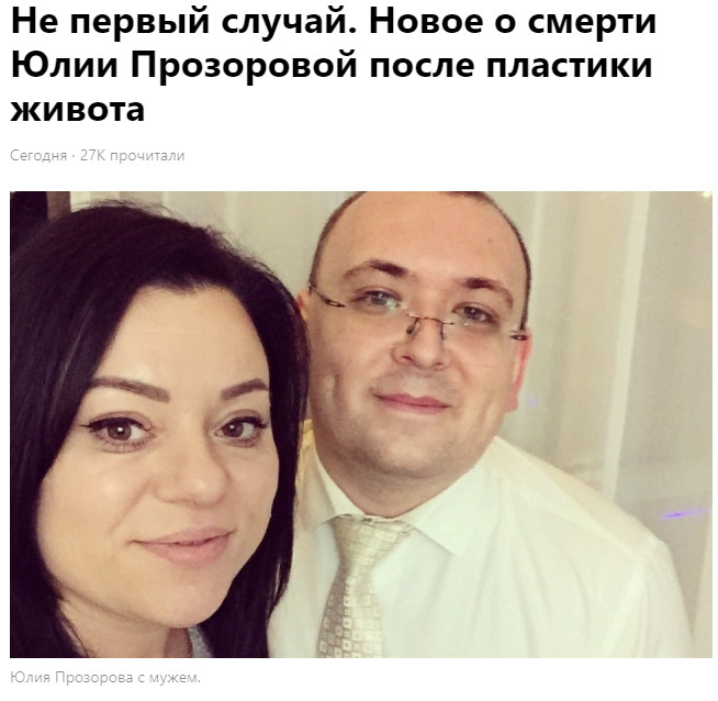 Трагедия произошла утром в понедельник, 15 апреля. Пластика живота становится смертельно опасной. После проведения абдоминопластики живота, то есть ушивания расхождения мышц и удаления кожно-жирового фартука, в столичной частной клинике скончалась 40-летняя пациентка Юлия Прозорова, домохозяйка и мать двоих детей. Вскрылись новые подробности о гибели пациентки в Москве.