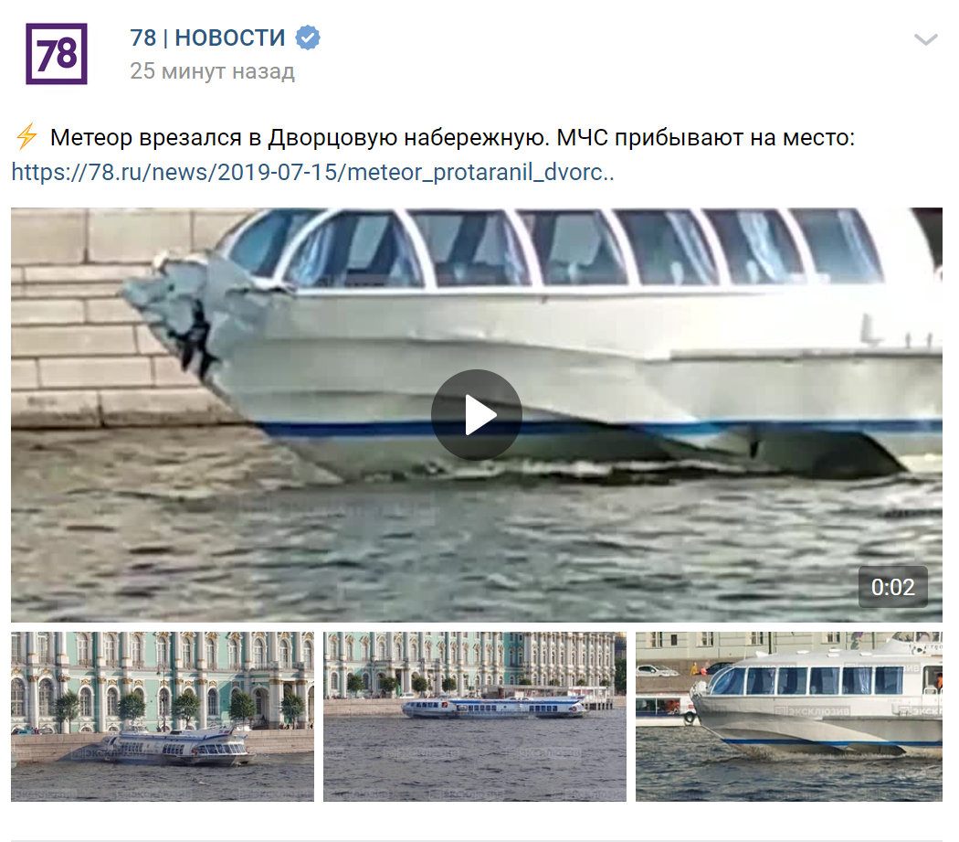 Телеканал "78" сообщил, что судно на подводных крыльях "Метеор" врезалось в Дворцовую набережную в Санкт-Петербурге.