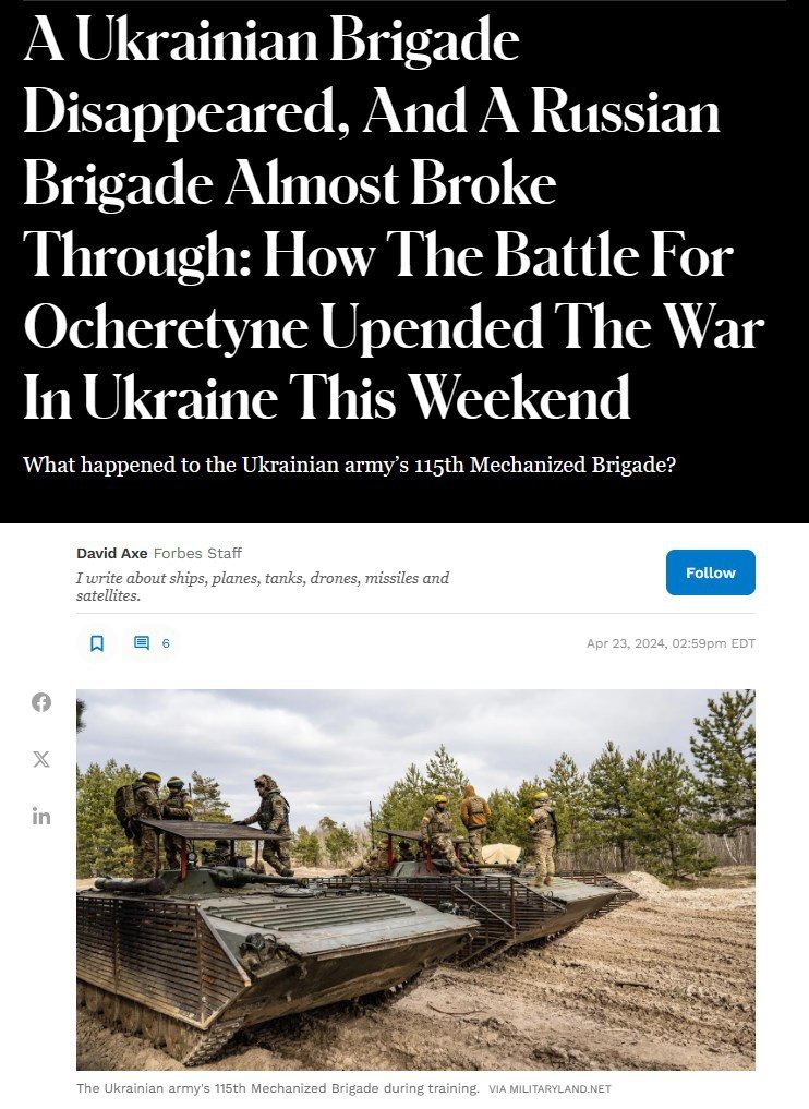 Forbes пишет, что прямо сейчас Киев не может позволить себе потерять целых 2 бригады, как и не может продолжать перенапрягать свои "лучшие бригады".