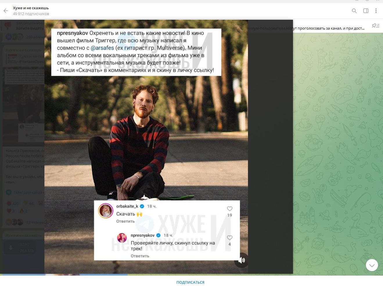 К тому же музыка из фильма доступна для скачивания в Сети. Надо полагать, удовольствие не бесплатное, потому что Пресняков с большим энтузиазмом призывает своих подписчиков "переходить по ссылке".