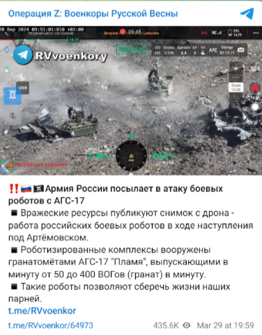 Армия России посылает в атаку боевых роботов с АГС-17. По сути, они представляют собой наземные дроны. Учитывая, что ранее широкое применение на фронте получили дроны-камикадзе и разведывательные беспилотники, можно сказать, что военное дело стало всё больше походить на то, каким его представляли фантасты.