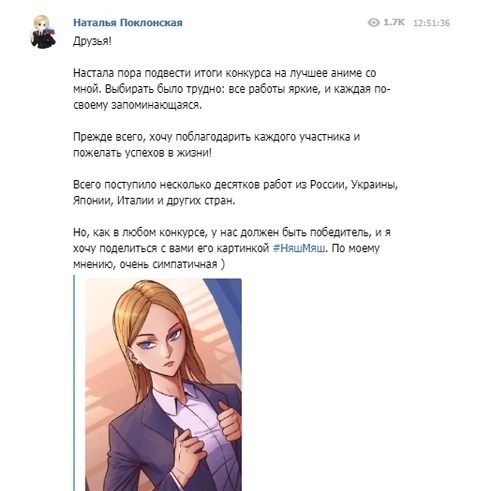 Зампред комитета Госдумы по международным делам Наталья Поклонская у себя в соцсетях провела настоящий конкурс на лучший рисунок себя в стиле японского аниме. Напомним, что в Японии депутат стала невероятно популярной: иностранцы решили, что внешность Поклонской идеально подходит для аниме. В результате за бывшим прокурором закрепилось в медиапространстве прозвище Няш-Мяш.
