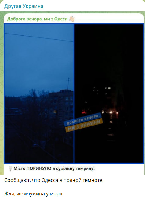 За одну ночь Одесса пережила две разрушительных атаки русской армии, оставшись надолго без света. Местные жители выставляли фотографии и видео, сидя в темноте и слушая нескончаемую ракетную тревогу.