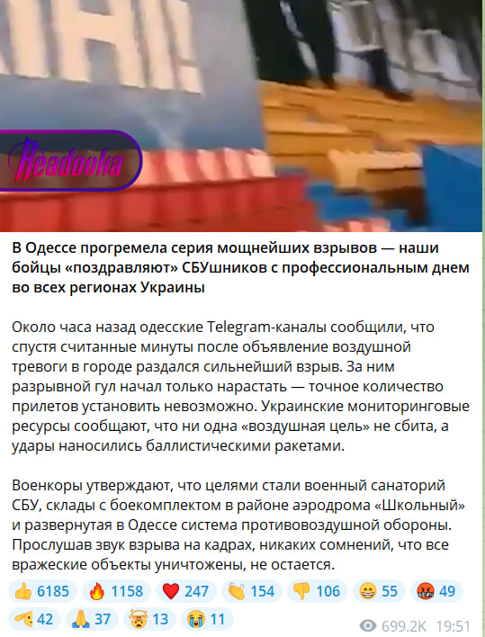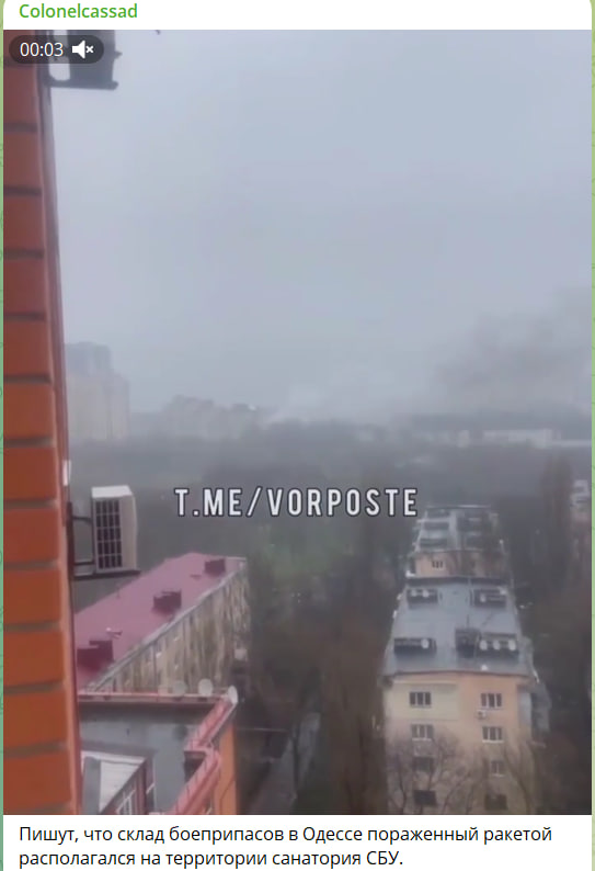 Сразу несколько источников сообщили, что было нанесено несколько ракетных ударов по месту дислокации личного состава СБУ - по тому самому ведомственному санаторию "Одесса". О том, что на его территории также мог располагаться склад боеприпасов, сообщал и эксперта Центра военно-политической журналистики Борис Рожин.