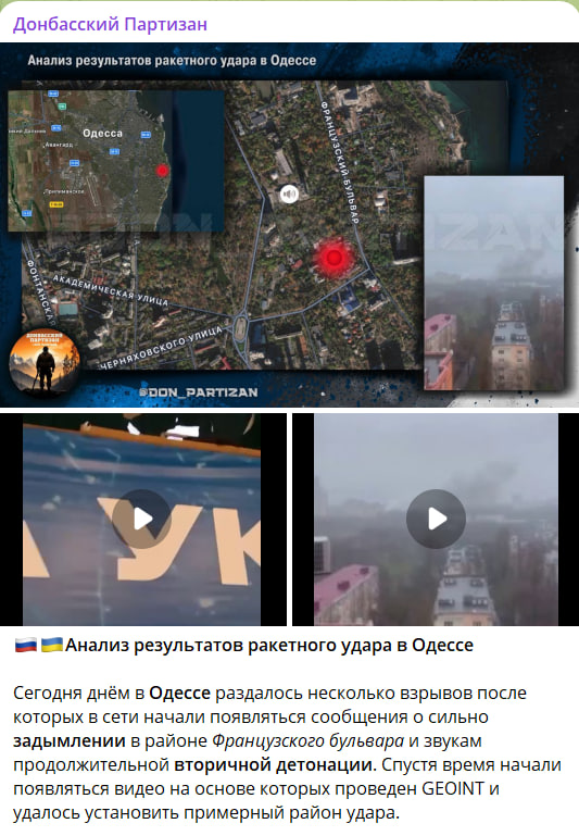 Одно из первых видео, появившихся в информационном пространстве, снято внутри Дворца спорта по проспекту Шевченко. Взрывная волна и звуки на видео указывают на близкое расположение цели удара к месту съёмки. Вскоре после этого было опубликовано ещё одно видео. Исходя из расположения и места съёмки удалось определить примерный район прилёта - квадрат ул. Академической, Французского бульвара и проспекта Шевченко. Также на видео отчётливо слышны звуки вторичной детонации боеприпасов. В указанном квадрате располагается три гостиничных комплекса, ботанический сад, несколько общепитов и санаторий "Одесса". Примечательно, что санаторий является оздоровительно-лечебным учреждением СБУ,