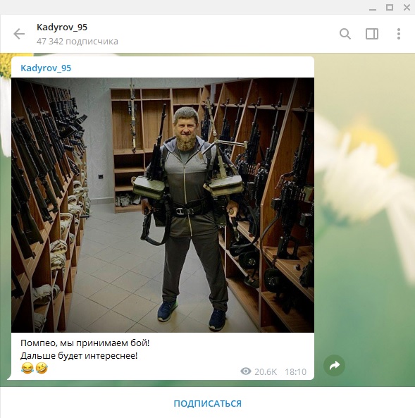 "Помпео, мы принимаем бой! Дальше будет интереснее!" - написал в ответ Кадыров на своём Telegram-канале.