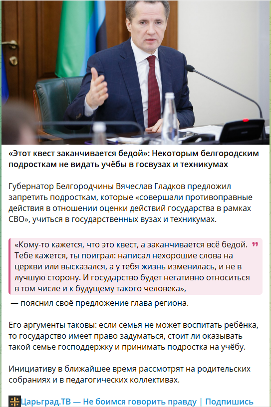 Учитывая, что выполнять «задания» незнакомцев соглашаются зачастую подростки, губернатор Белгородской области Вячеслав Гладков выступил с предложением лишать совершивших противоправные действия в рамках СВО возможности учиться в государственных вузах и техникумах.