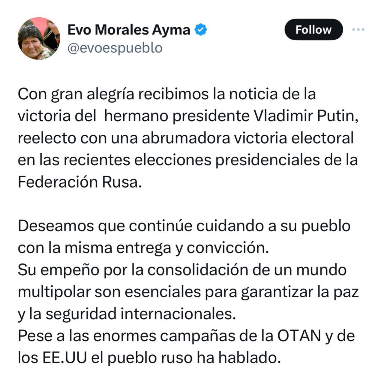 Особенно порадовал бывший президент Боливии Эво Моралес, открыто заявивший, что Владимир Путин бросил вызов глобалистскому Западу.