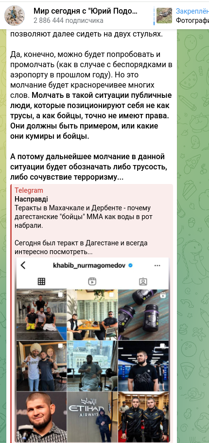 Юрий Подоляка высказал схожее мнение, отметив, что, может, потому дагестанские бойцы MMA и молчат в своих соцсетях?