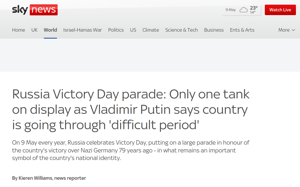 Британское издание по-своему объяснило, почему в этом году на Красной площади на Параде Победы был лишь один танк: "На параде в Москве на протяжении всего показа присутствовал только один танк, поскольку страна продолжает выделять значительную огневую мощь и ресурсы на войну на Украине".