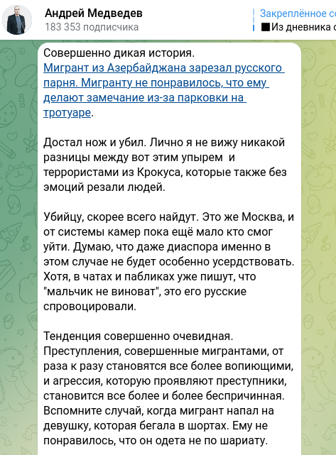 Но проблема ещё и в том, что представители азербайджанской диаспоры уже стали оправдывать Шахина... На этот факт обратил внимание журналист и депутат Московской городской думы Андрей Медведев, который для себя не видит никакой разницы между Аббасовым и террористами из "Крокуса", которые так же без эмоций резали людей.