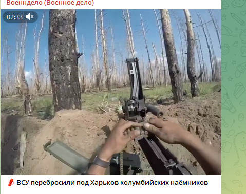 Ещё одно видео, опубликованное в Сети, показывает, как колумбийский военный с пулемётом в руках противостоит русским солдатам. Съёмка проводилась от первого лица. Солдат вёл себя достаточно уверенно, изредка отстреливаясь из наспех вырытого окопа. Стрелял наёмник вслепую: на каждую очередь пулемёта русские отвечали миномётным огнём. Повсюду звучала испанская речь. Очевидно, что колумбийцы ведут боевые действия в составе изолированного отдельного подразделения.