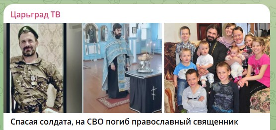 Кстати, погибший батюшка ушёл на фронт добровольцем. До этого он был настоятелем Спасского храма Канска в Красноярском крае. Дому у него осталась жена и одиннадцать детей. Их, подчеркнул Басакин, не оставят без поддержки: "Я знаю, что по церковным правилам его поддержат во всех отношениях... Ни церковь, ни государство равнодушными точно не остаются, это я точно знаю".