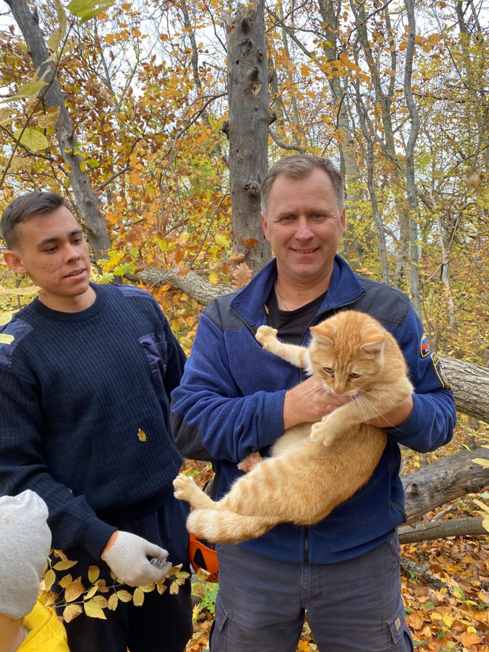Судя фото, рыжий котик жалобно маякал на дереве, был сильно напуган и даже сразу не бросился к хозяйке.