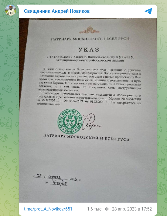 Патриарх Кирилл утвердил лишение Кураева* священного сана. Скриншот t.me/prot_A_Novikov