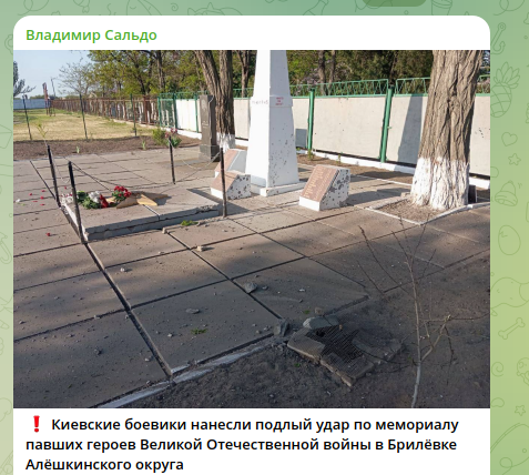 Киевские боевики нанесли подлый удар по мемориалу павших героев Великой Отечественной войны в Брилёвке Алёшкинского округа,