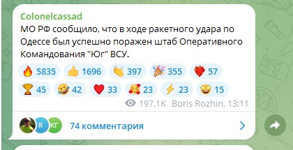 В украинских СМИ со ссылкой на спикера командования воздушных сил ВСУ Илью Евлаша распространили сведения о том, что русская армия применила для удара по Одессе баллистические ракеты "Искандер-М". Всего их было использовано три единицы. По версии противника, запуск был осуществлён с территории Крыма.