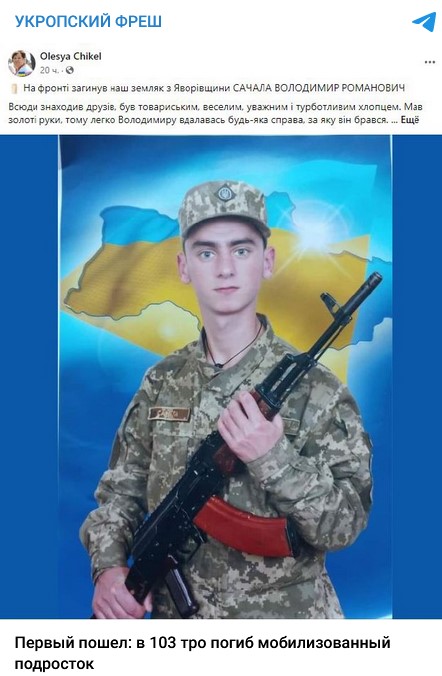 Только совсем недавно стало известно, что в центре подготовки резервов "Гайдамацкая сечь" прошла обучение первая партия мобилизованных 17-летних сирот, которых через некоторое время отправили в распоряжение командира 103-й бригады территориальной обороны полковника Валерия Курко. И вот уже первая смерть несовершеннолетнего, которая открывает счёт десяткам и сотням таких ребят.
