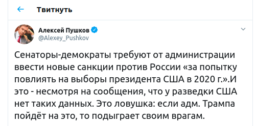 Пушков также отметил чуть позже, что если Вашингтон всё же введёт новые антироссийские санкции, то "фактически признает правоту тех, кто утверждает, будто Россия "играет на выборах на стороне Трампа". По мнению российского политика, именно в этом и заключается "смысл требования демократов".