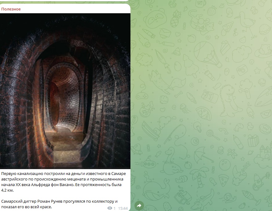 Сенсационное открытие удалось сделать исследователю Роману Руневу. Под Струковским садом - старейшим парком Самары - он обнаружил подземный туннель первой городской канализации. Выяснилось, что этот коллектор был проложен в начале XX века на средства австрийского промышленника и мецената Альфреда фон Вакано.