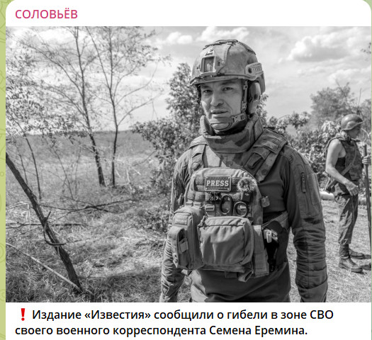 Издание "Известия" сообщило о гибели в зоне СВО своего военного корреспондента Семёна Ерёмина. Он погиб при выполнении профессиональных обязанностей, снимая репортаж.