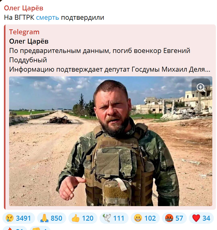 Немного деталей о том, что случилось с Поддубным, сообщил политик Олег Царёв. Он указал, что на ВГТРК, где работал военкор, подтвердили информацию о гибели Поддубного - в его машину якобы попал взрывной дрон.