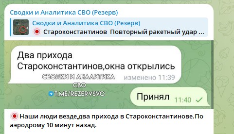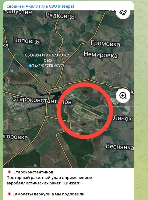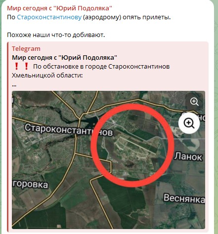 Украинские военные источники сообщают о взрывах на военном аэродроме в Староконстантинове Хмельницкой области. По предварительной информации, бьют русские "Кинжалы".