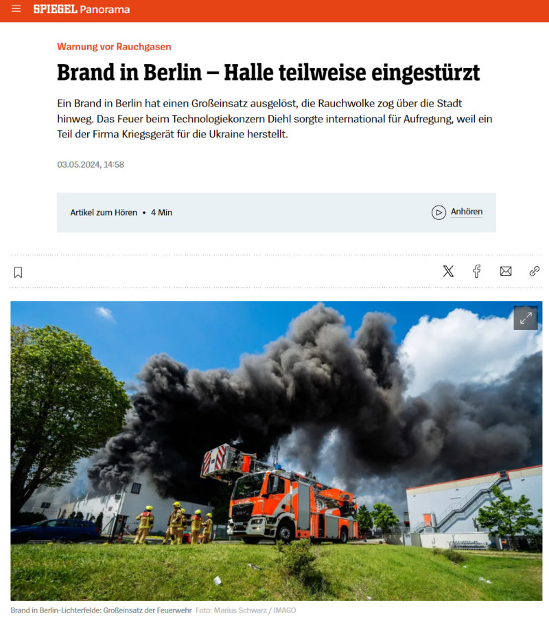 Эксклюзив: Российское государство может нести ответственность за пожар немецкого оружейного концерна Diehl в начала мае в районе Берлина Лихтерфельде. По моей информации, зарубежная разведка проинформировала немецкие службы о наличии конкретных данных о причастности России,