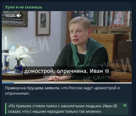 Правнучка Хрущёва в интервью пыталась сформировать образ "дикой России". На вопрос о том, что нашу страну ждёт дальше, она заявила: "Домострой, опричнина, Иван III". И привела пример якобы из истории правления этого царя.