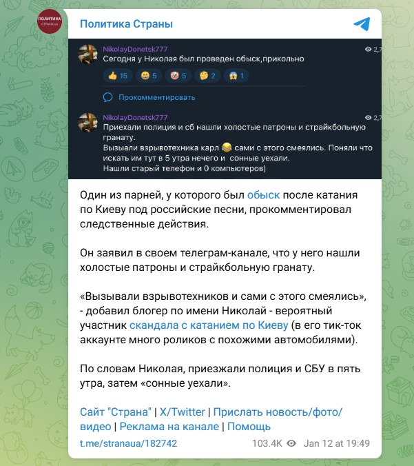 Сами бунтари тем временем и вовсе дают отпор. Один из них, молодой человек по имени Николай, в своём телеграм-канале написал, что в пять утра к нему нагрянули сотрудники не только полиции, но и СБУ.