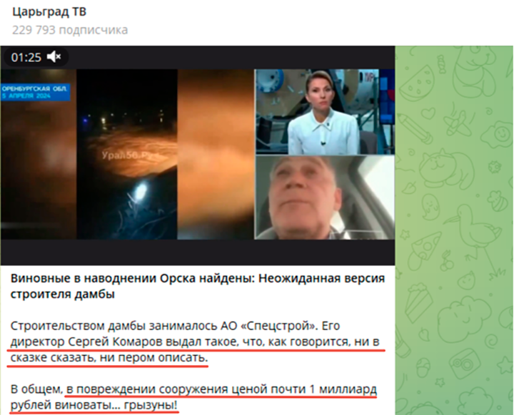 ВЕРСИИ ЭКС-РУКОВОДИТЕЛЯ КОМПАНИИ - ЗАСТРОЙЩИКА ДАМБЫ УДИВИЛИСЬ ДАЖЕ ДАВНО ПРИВЫКШИЕ К САМЫМ РАЗНООБРАЗНЫМ "ЧУДЕСАМ" СВОИХ КОММЕНТАТОРОВ ВЕДУЩИЕ ПЕРВОГО КАНАЛА//СКРИНШОТ ПОСТА В ТГ-КАНАЛЕ "ЦАРЬГРАД ТВ"