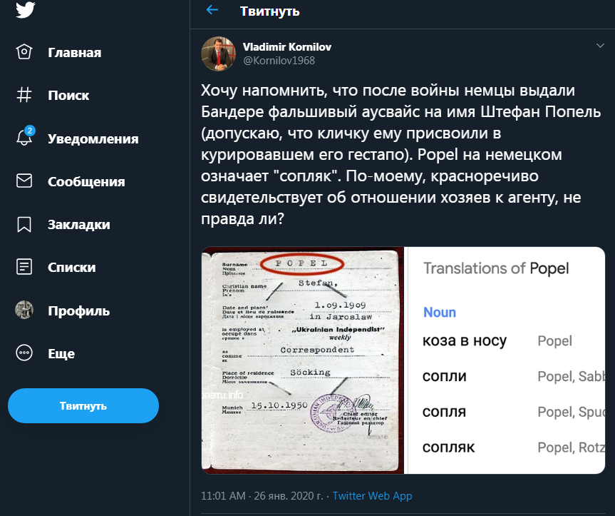 Предполагается, что фальшивые документы Бандера получил уже после окончания войны, однако точных данных по этому поводу нет. Тем не менее тот факт, что по новым документам лидер украинских националистов имел столь неблагозвучную фамилию, говорит о том, насколько "ценным" агентом он был.