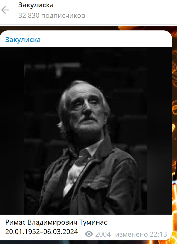 Директор Театра имени Евгения Вахтангова Кирилл Крок сообщил о смерти театрального режиссера Римаса Туминаса. Туминас скончался на 73-м году жизни после продолжительной болезни в итальянской клинике.