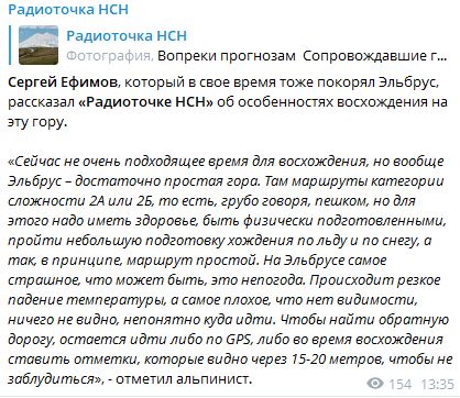 Ефимов отметил, что для поиска обратной дороги в условиях плохой видимости надо либо идти по GPS, либо по заранее оставленным отметкам. Именно поэтому альпинист считает, что в истории с попавшей в буран группой виноваты не гиды, а оператор, который отправил их в горы, не проверив прогноз погоды.