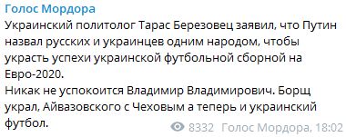 Никак не успокоится Владимир Владимирович. Борщ украл, Айвазовского с Чеховым украл, а теперь и украинский футбол, - пишет Telegram-канал "Голос Мордора".